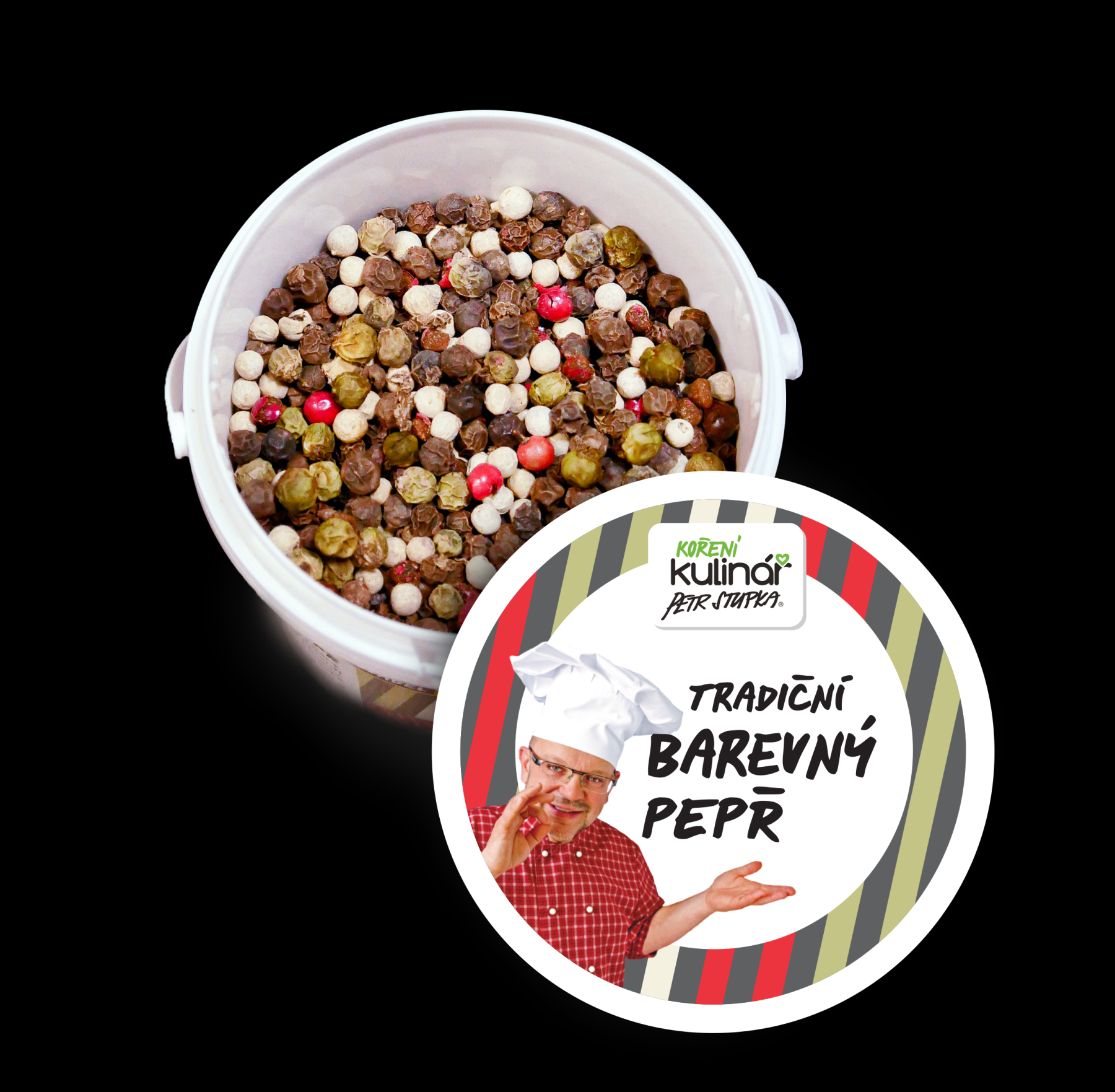 Obsahuje zmes čierneho, zeleného, bieleho a červeného korenia