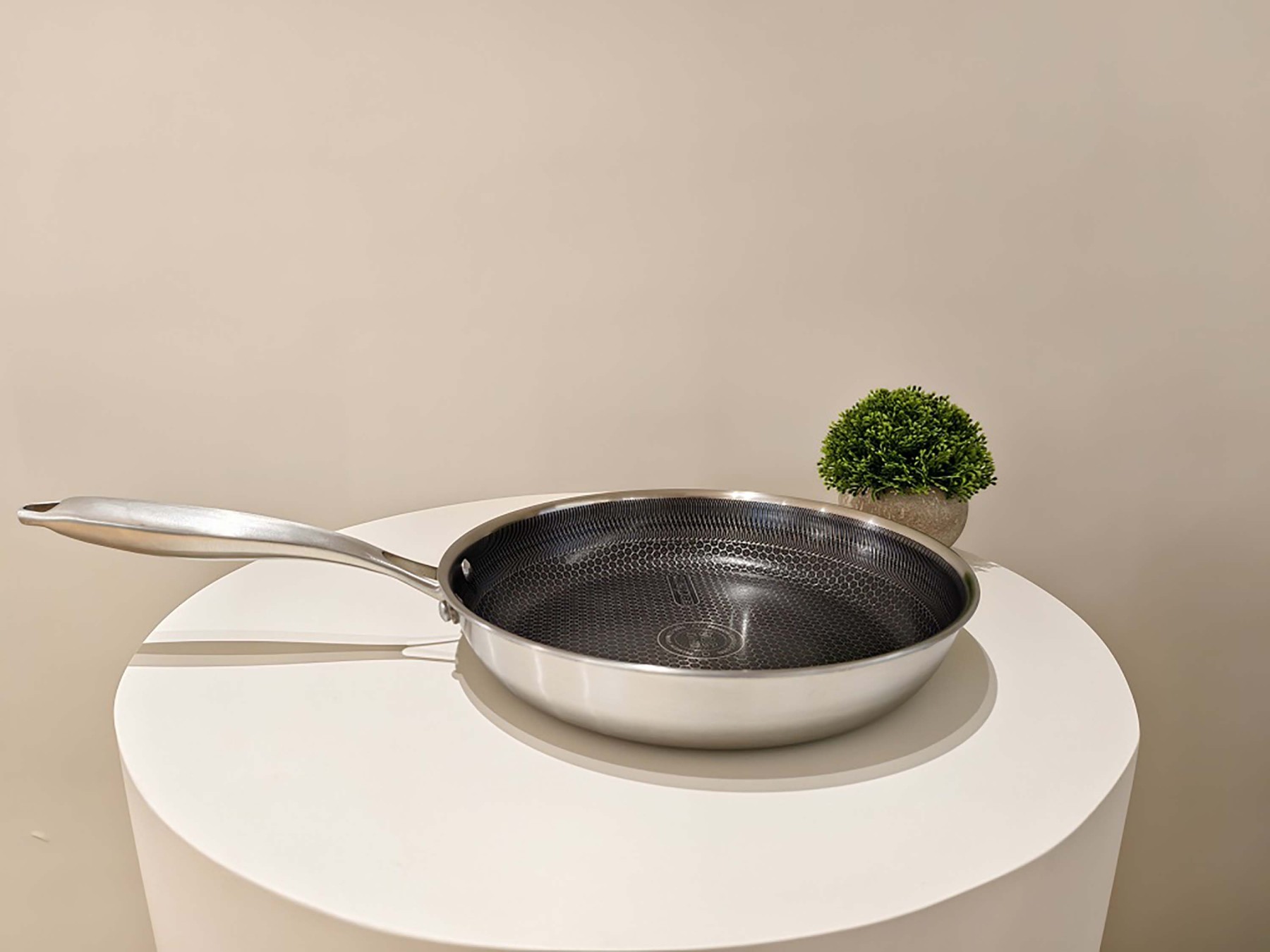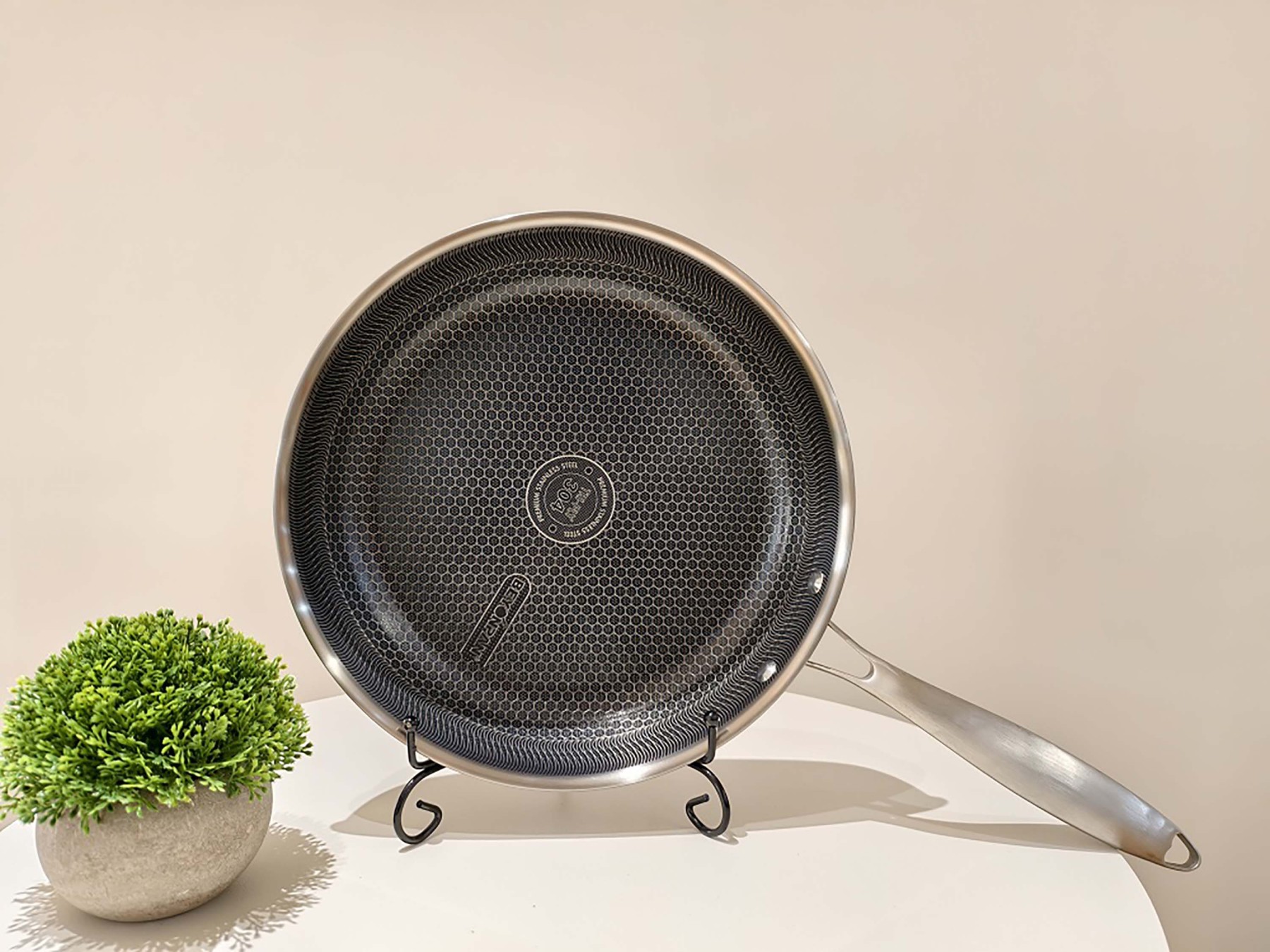 Ergonomická rukoväť je prinitovaná dvoma masívnymi nitmi – pevne, stabilne, s istotou aj pri plnom zaťažení. Vďaka celonerezovému prevedeniu je možné panvicu použiť na všetkých typoch sporákov vrátane indukcie, a bez obáv aj v rúre.