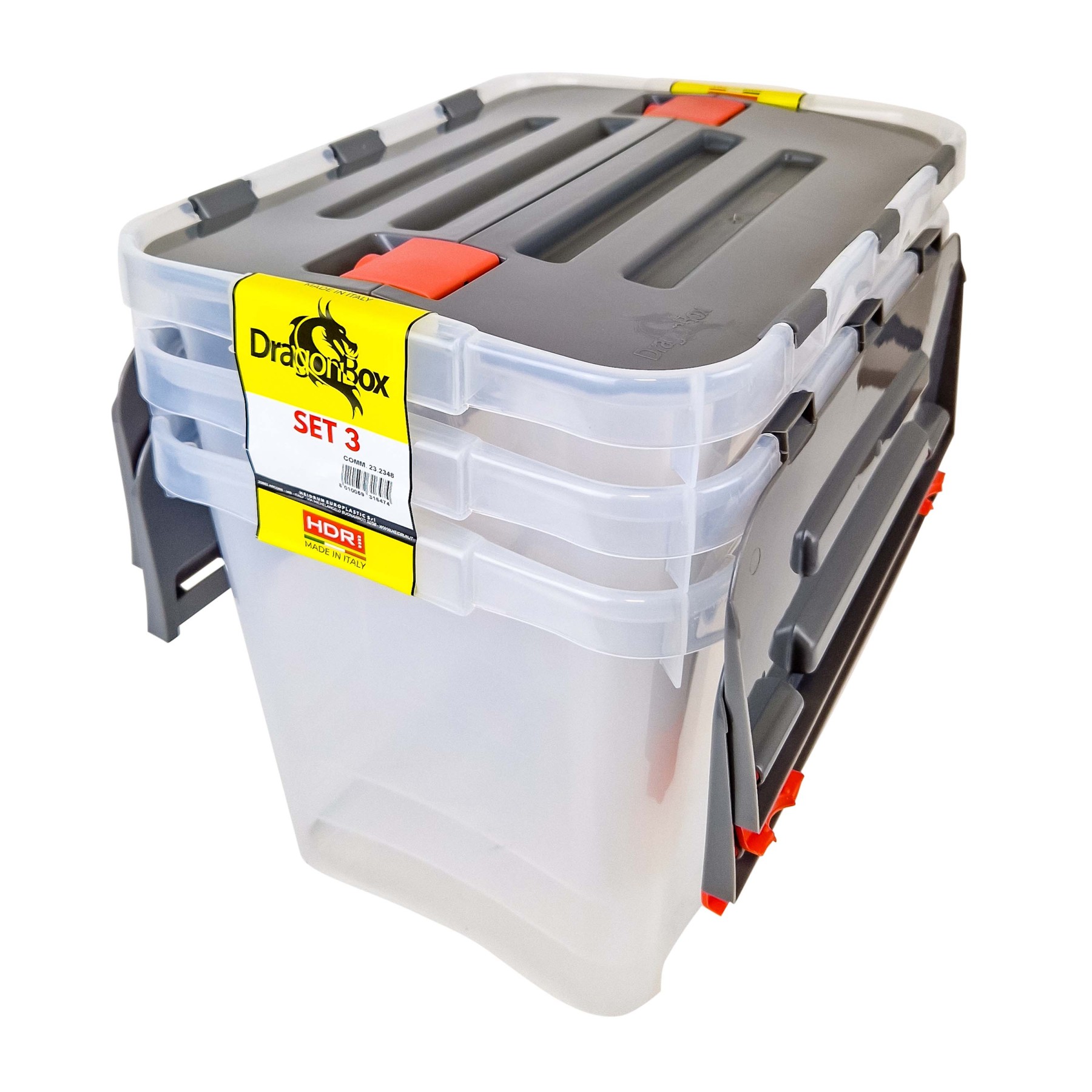 Sada plastových úložných boxov HEIDRUN 24 l s praktickým vekom. Kvalitný plastový box je skvelým pomocníkom na ukladanie, skladovanie a ochranu veľkých predmetov a drobností, oblečenia, hračiek a prikrývok. Úložný box chráni všetko pred nečistotami, prachom, vlhkosťou a poškodením. Vďaka priehľadnému materiálu máte všetko prehľadne a bezpečne uložené na policiach, v skrini alebo pod posteľou. Úložné boxy sú veľmi užitočné aj v garáži alebo dielni. Ľahko ovládateľné dvojdielne výklopné veko. Súprava obsahuje 3 úložné boxy s vekom.