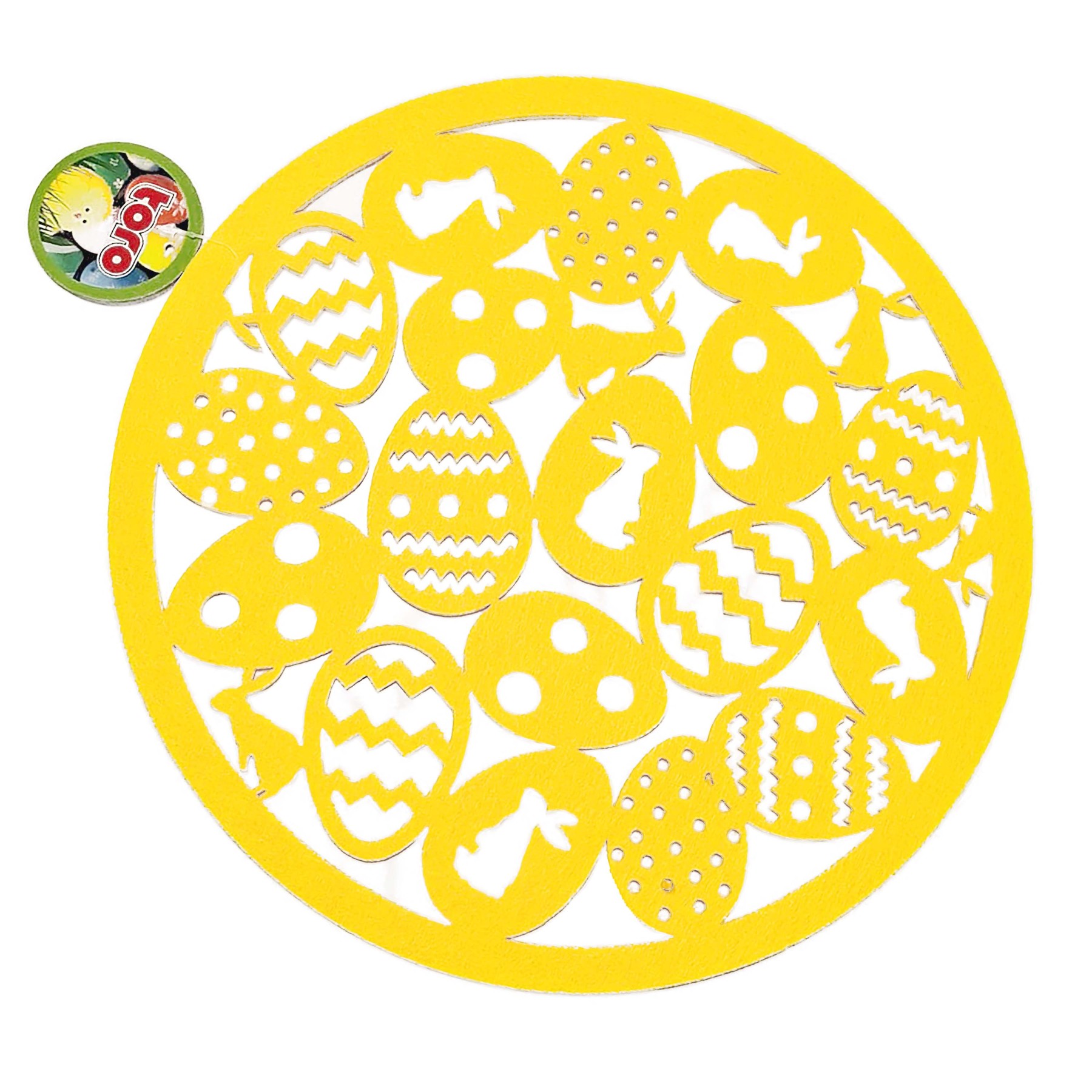 Plstené okrúhle prestieranie je nielen praktickým pomocníkom v domácnosti, ale aj krásnou dekoráciou. Toto prestieranie je veľmi praktické, jeho štýl očarí každého. Priemer 33 cm, v žltej farbe, vzor - vajíčko a zajac.