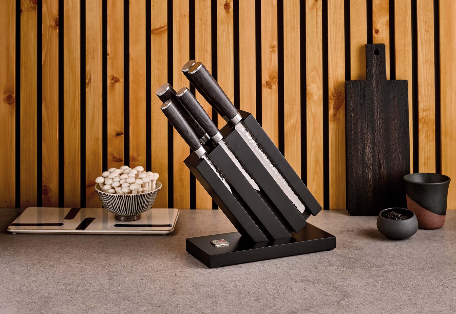 Čierny blok v elegantnom mate nielen bezpečne chráni nože, ale zároveň podčiarkuje ich modernú siluetu – vytvára kontrast medzi lesklým ostrím a tmavým povrchom, ktorý pôsobí luxusne a čisto. Nože sú dokonale vyvážené, padnú do ruky a pri práci poskytujú istotu aj pohodlie. Taper-brúsené čepele zaisťujú precíznu kontrolu nad každým pohybom, či už krájate mäso, zeleninu alebo pečivo.