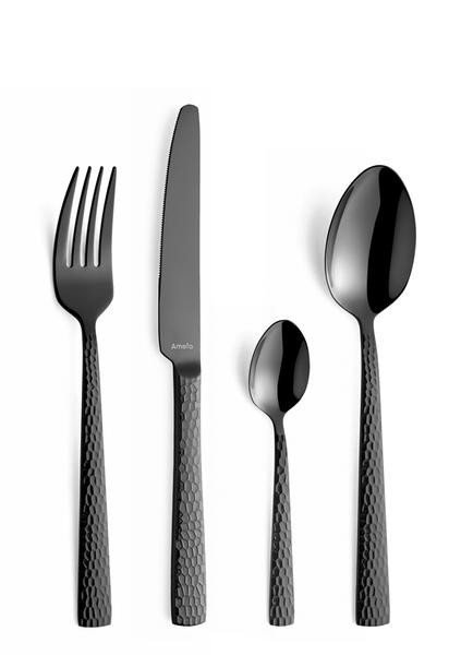 Súprava príborov AMEFA Felicity je stvorená pre tých, ktorí chcú stolovať s výrazom a vkusom. Jej čierny matný povrch, doplnený o ručne „hammered“ štruktúru rukovätí, pôsobí súčasne ako skulptúra aj funkčný nástroj – rukoväť jemne odráža svetlo a vytvára hru na stole, zatiaľ čo povrch odoláva bežnému opotrebovaniu. Použitá nerezová oceľ ponúka silnú konštrukciu a dlhú životnosť, takže každý kus v sade odráža kvalitu a premyslené spracovanie. Dizajn Felicity tak nie je len praktickým náradím, ale aj výrazom štýlu pre modernú domácnosť.